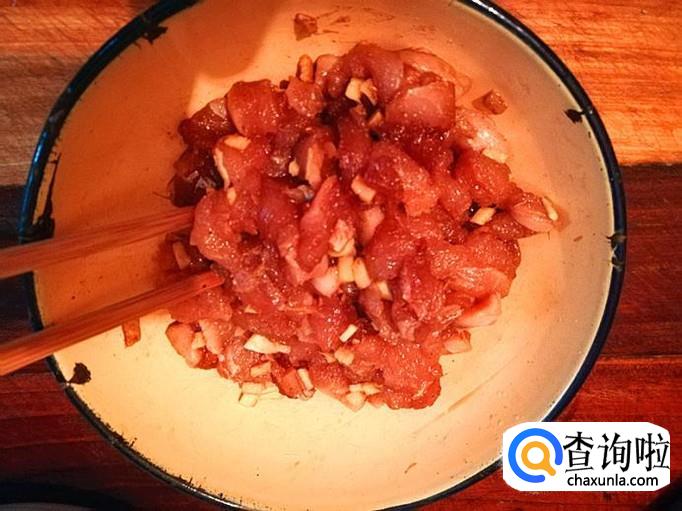 猪肉切成小块,把蒜和生姜切成小丁丁,装碗里,再加入适量的食盐、酱油等自己调料搅拌均匀腌制10分钟左右。