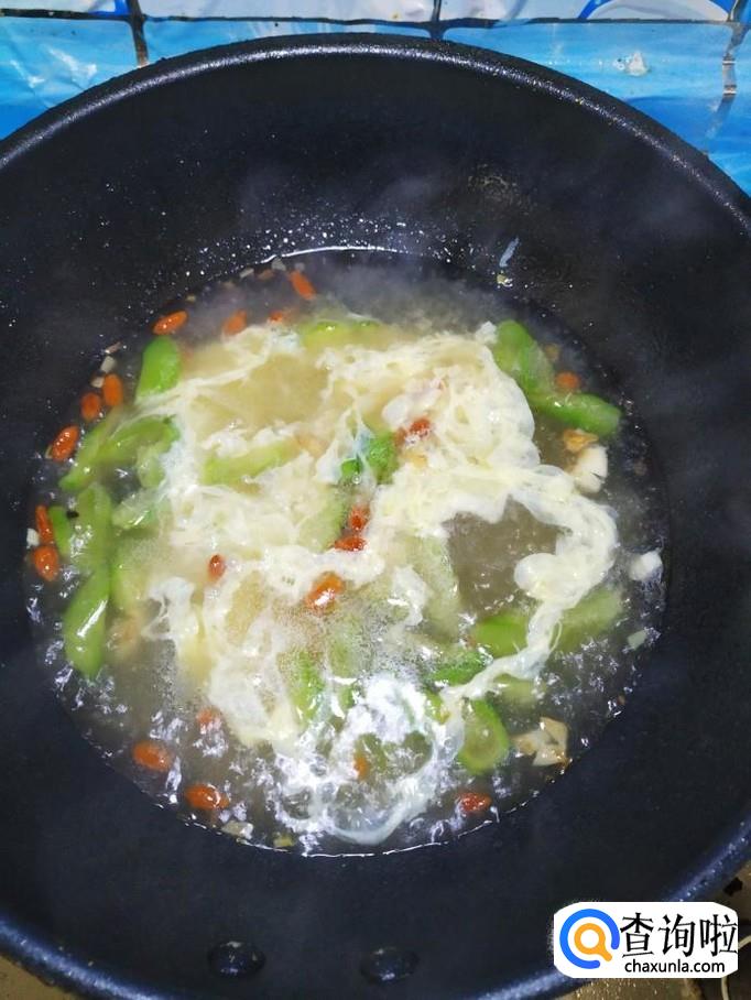 大火将水烧开,水开后转小火,煮五分钟左右,然后将鸡蛋淋入锅中,鸡蛋受热后,很快变成鸡蛋花飘在锅中了。
