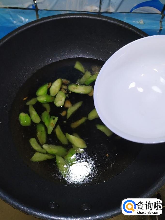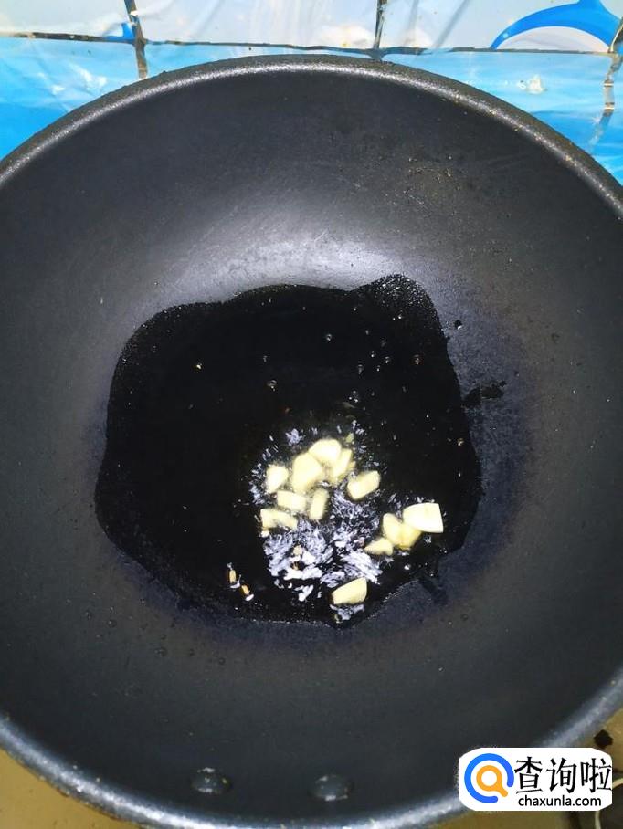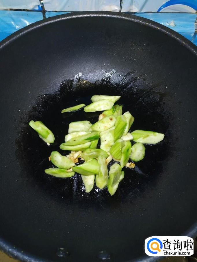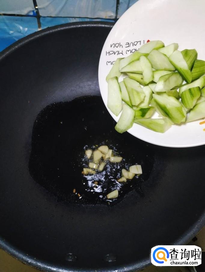 准备适量蒜,去除外衣后,切成片,炒锅中放入适量油,油热后,放入蒜片爆香,然后将丝瓜倒入锅中,翻炒均匀。
