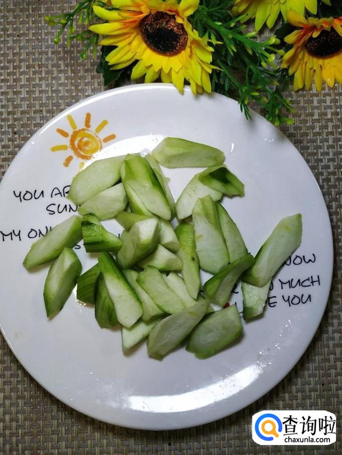 准备一个比较嫩的丝瓜,洗净去皮后,切成滚刀块,放入盘中备用。注意,在选购丝瓜的时候,一定要选择比较嫩的。