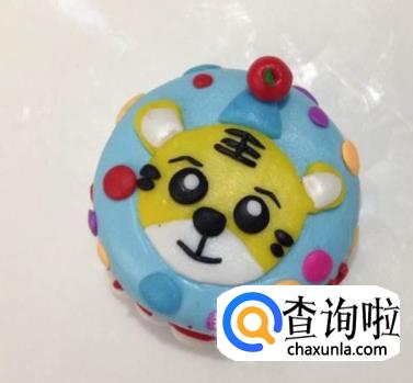 最后再用一些其他颜色的粘土将老虎的眼睛、鼻子和嘴巴补充完整,最后还可以在蛋糕的周围贴一些其他颜色的粘土,形状用圆形就好啦。这样,小蛋糕就制作完整啦,是不是很简单呢?
