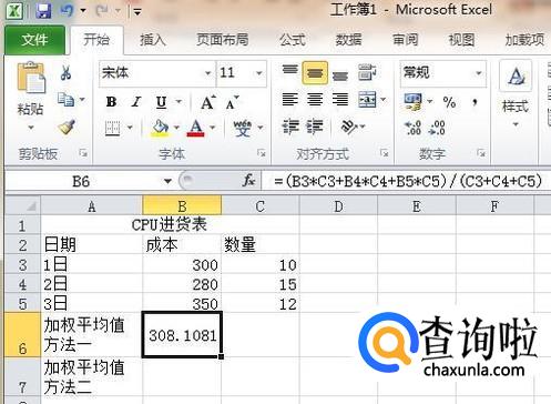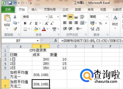 公式输完确定后,得数就出来了,加权平均成本就是308.1081。