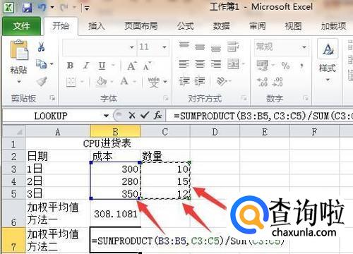 第二种方法是用函数计算,输入=SUMPRODUCT(B3:B5,C3:C5)/SUM(C3:C5)