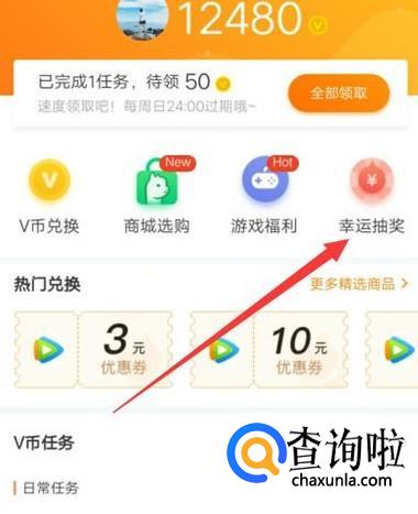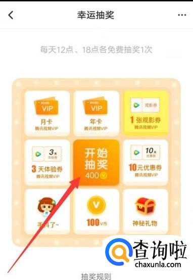 进入之后,即可通过v币抽取免费的腾讯视频的VIP体验,如图所示。