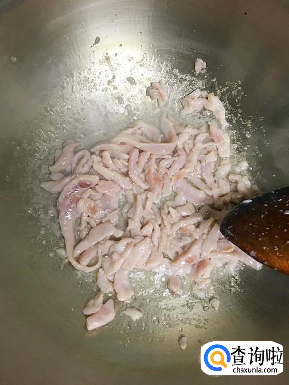 油锅烧热,把处理好的里脊肉丝放入锅中,翻炒至变色。