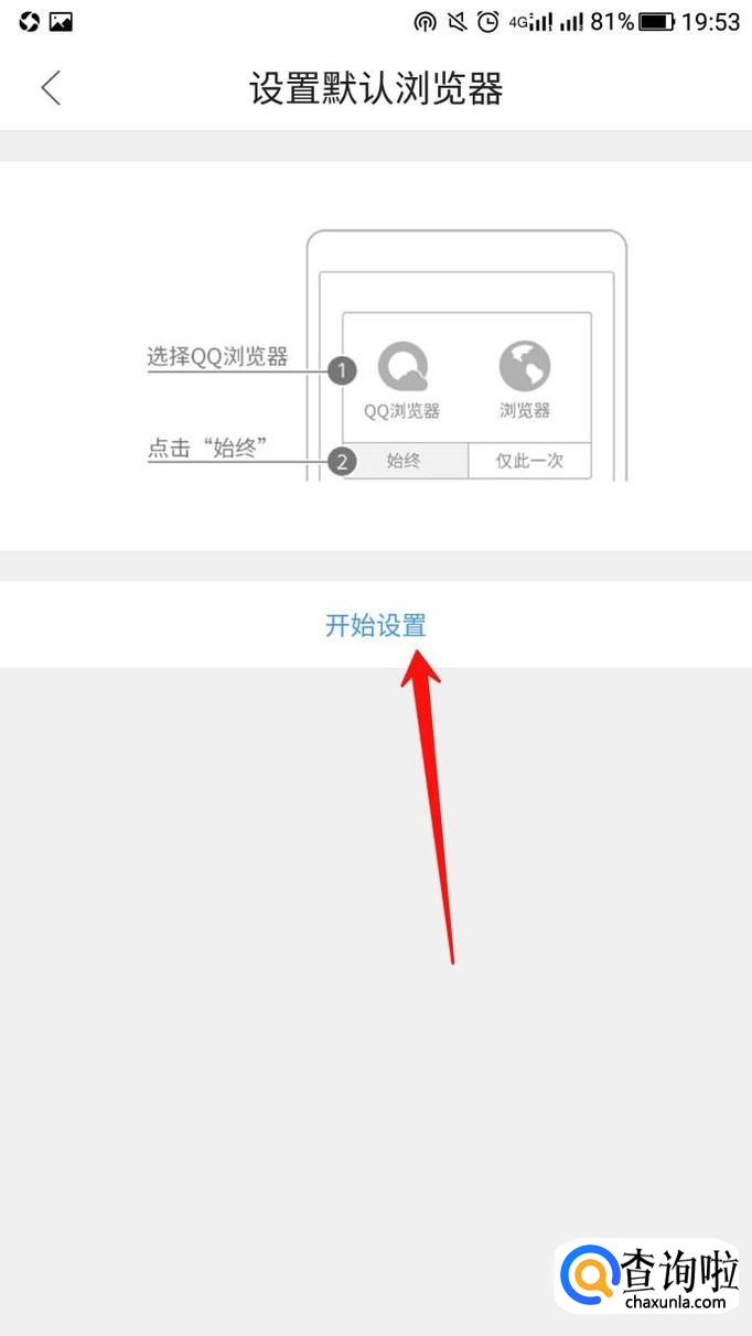 进入以后,便可以看到开始设置,最后点击,便可以把QQ浏览器设置为默认浏览器了。