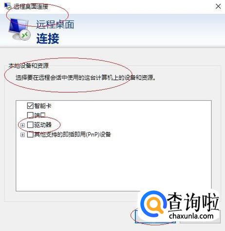 如图所示,弹出"本地设备和资源"对话框。勾选"驱动器"复选框,点击"确定→连接"按钮。