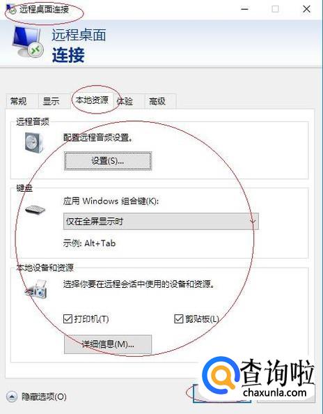 选择"本地资源"标签,如图所示。设置远程音频和键盘,点击"本地设备和资源→详细信息"按钮。