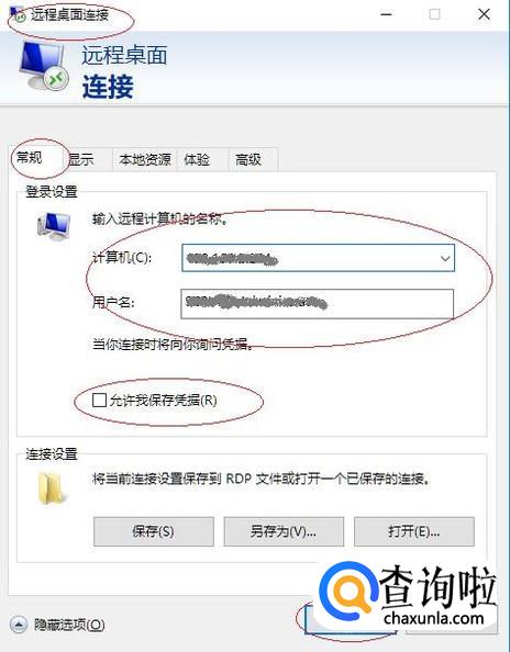 如图所示,唤出"远程桌面连接选项"界面。选择"常规"标签,勾选"允许我保存凭据"复选框。