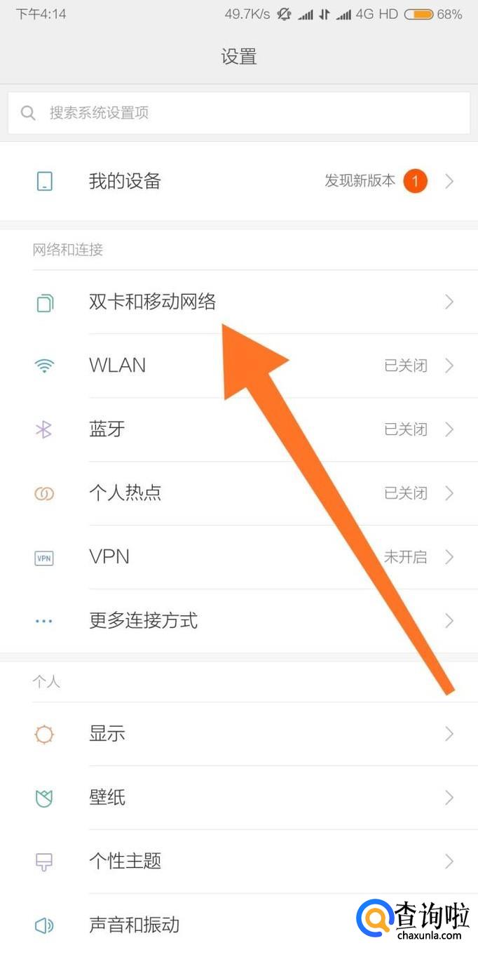 找到“双卡和移动网络”设置选项,点击进入。