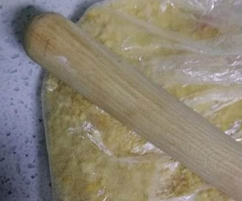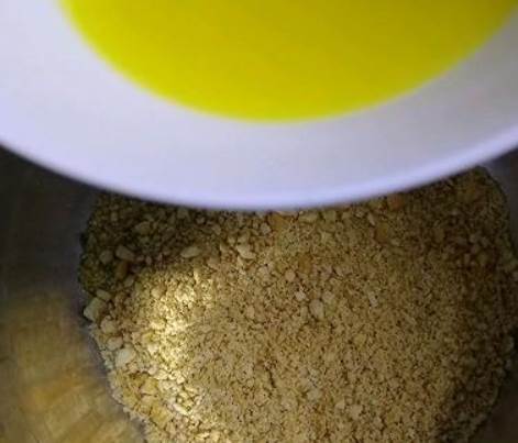 2.黄油隔水加热至融化后,倒入饼干碎中,混匀后填入6寸活底蛋糕模,压实压平,放入冰箱冷藏1个小时;