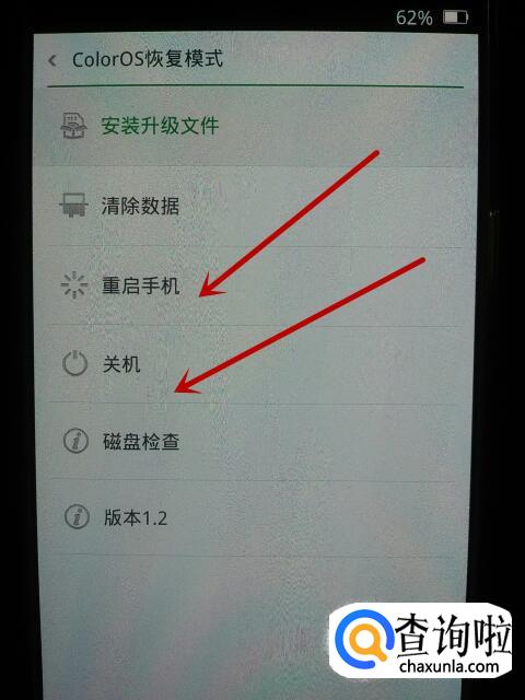 我们将看到ColorOS恢复模式界面。如果想要退出ColorOS恢复模式,点击“重启手机”或点击“关机”选项,然后再次开机就可以啦。
