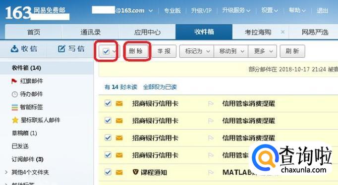 登录之后,就进入了个人邮箱界面,如图所示,平时我们删除邮件的时候,经常的操作步骤就是选中不想要的邮件前面的复选框,或者点击全选,然后点击“删除”。