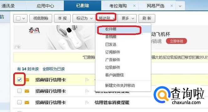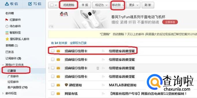 此时,我们在需要恢复的邮件前面打勾,然后点击“移动到”,“收件箱”,就能把已经删除的邮件找回了,如果我们彻底不需要这些邮件了,我们在“已删除”界面,点击“彻底删除”就好了,这样操作后,删除的邮件就找不回来了。