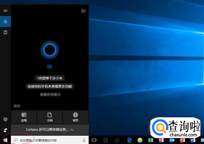 启动Windows 10操作系统,如图所示。点击任务栏搜索框,开始使用Cortana(小娜)智能语音助理。