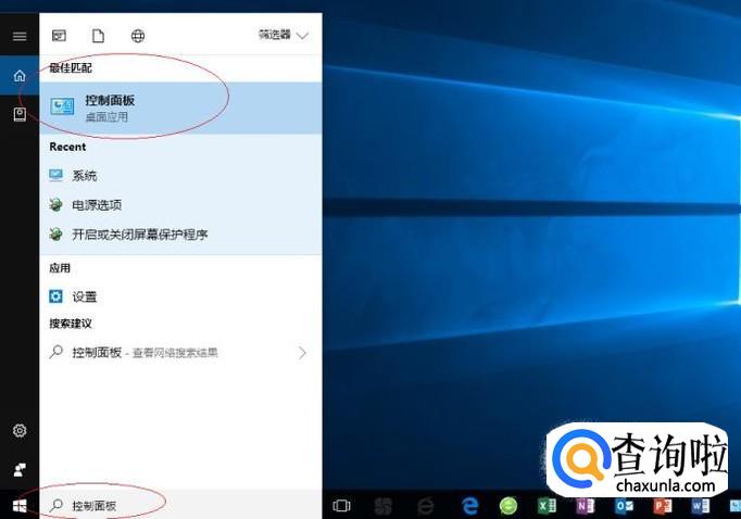 如图所示,搜索框输入"控制面板"。Cortana(小娜)显示搜索结果,点击"最佳匹配→控制面板"项。