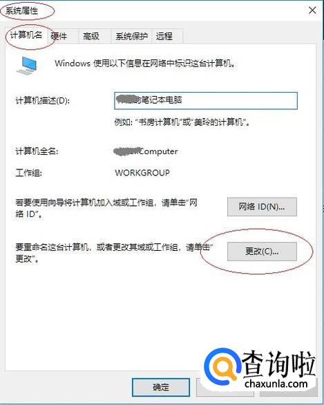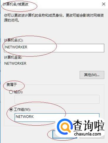 弹出"计算机名/域更改"对话框,如图所示。计算机名文本框输入计算机名,勾选"隶属于→工作组"复选框、输入工作组名。