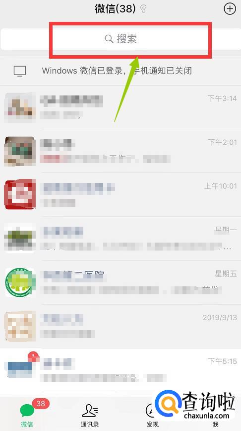 打开手机上的微信APP,进入微信首页后,点击顶部的放大镜图标(搜索)。