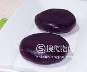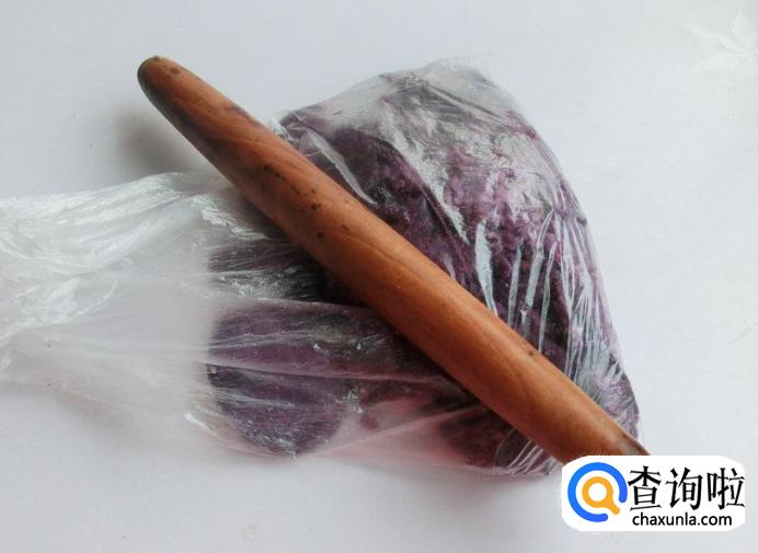 紫薯蒸熟后去皮,放入保鲜袋中,用擀面杖擀平。