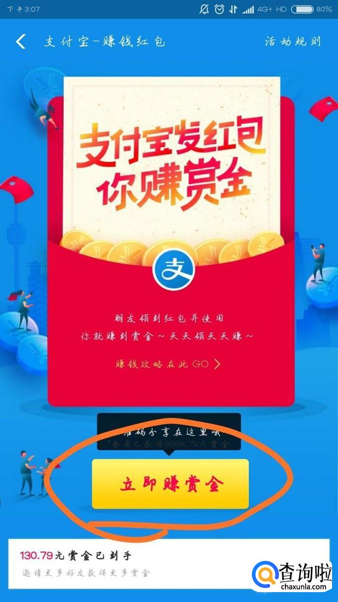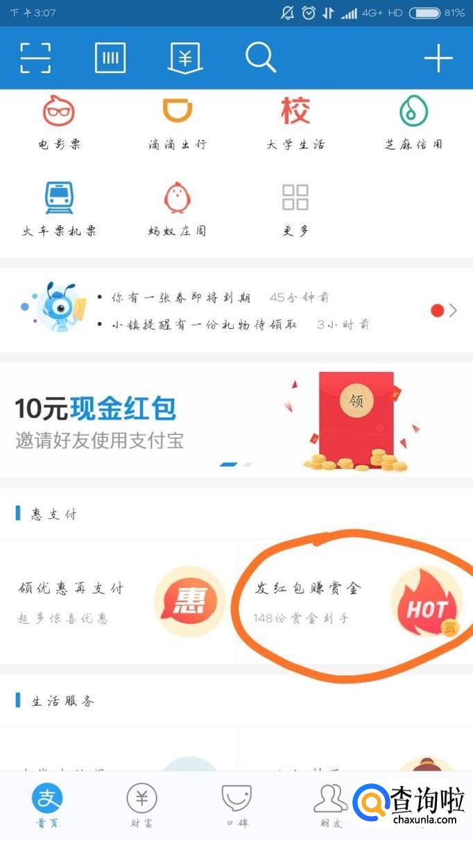 打开支付宝的首页,点击“发红包赚赏金”页面,如下图所示