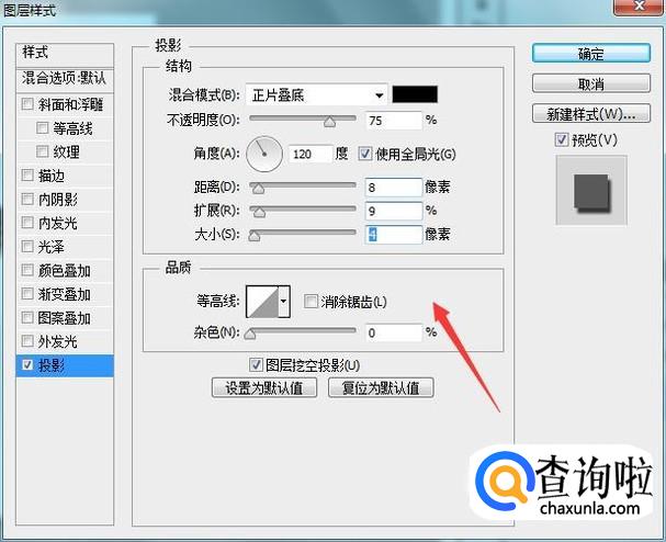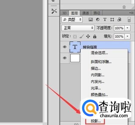选择文字图层在下面找到图层样式选项,点击该选项在其内找到投影选项,如图所示:
