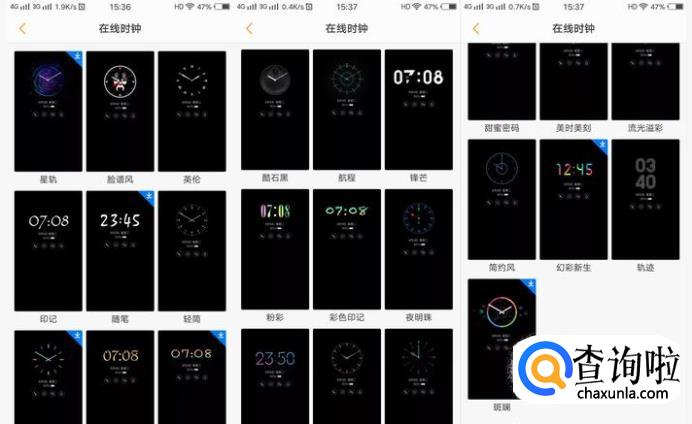 除了系统目前自带的7种时钟样式外,还提供了【在线时钟】功能,点开时钟样式列表的右上角【在线时钟】,可以看到这里提供了更多时钟样式:星轨、英伦、印记、随笔、轻简、七彩棒、幻彩新生、斑斓等等,给用户有了更多选择的空间,并且所有在线时钟都是免费提供用户使用的。