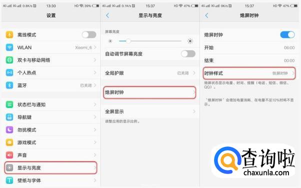 如果系统默认没有开启熄屏时钟,我们可以通过【设置】→【显示与亮度】→【熄屏时钟】进入熄屏时钟界面里开启。在这里可以自定义熄屏时钟的开始和结束时间,如果想一直开启,只要把开始时间设置为00:00,结束时间设置为23:59即可。
