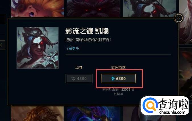 在接下来打开的页面中,选择使用蓝色精粹或者是点券来购买该英雄。