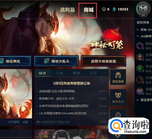 首先,我们使用QQ号码登录并打开LOL游戏界面,点击游戏界面中的“商城”菜单选项。