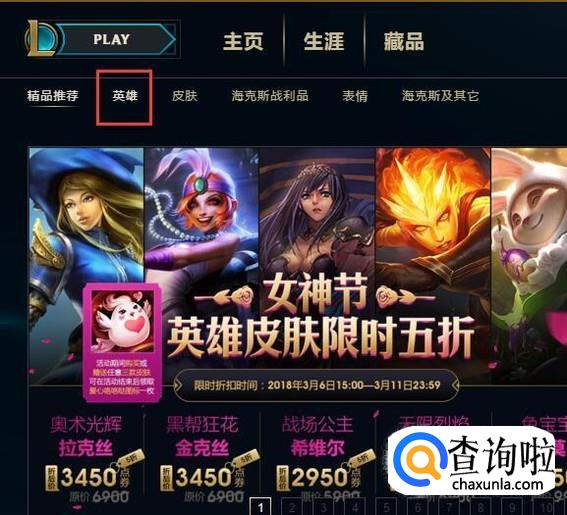 打开LOL游戏商城页面之后,点击页面中的"英雄"选项。