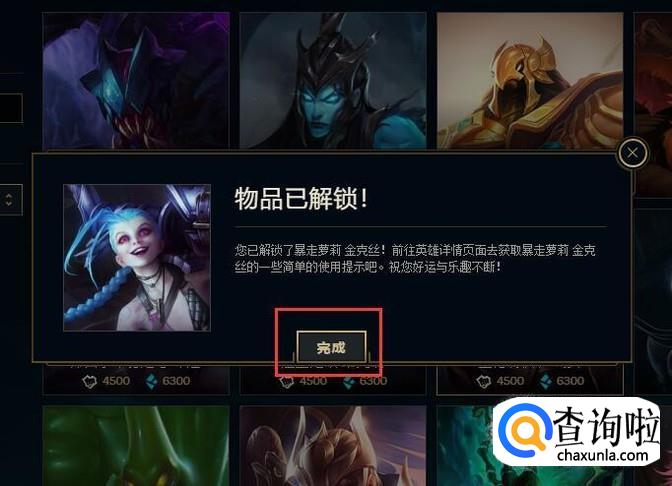 最后,我们即可获得该英雄,页面显示该物品已解锁,点击"完成"按钮即可。