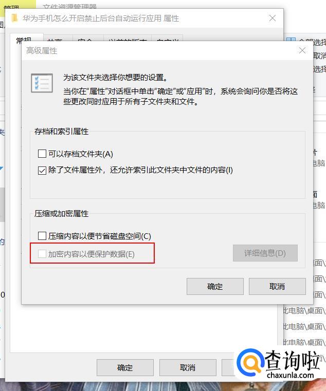 在【常规】选项卡,点击【高级】。选中【加密内容以便保护数据】复选框。