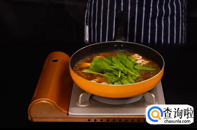 另取一锅,在锅中倒水,加入泡面调料包、蘑菇、荷兰豆、萝卜、菠菜煮熟。煮熟后,盛入盘中。