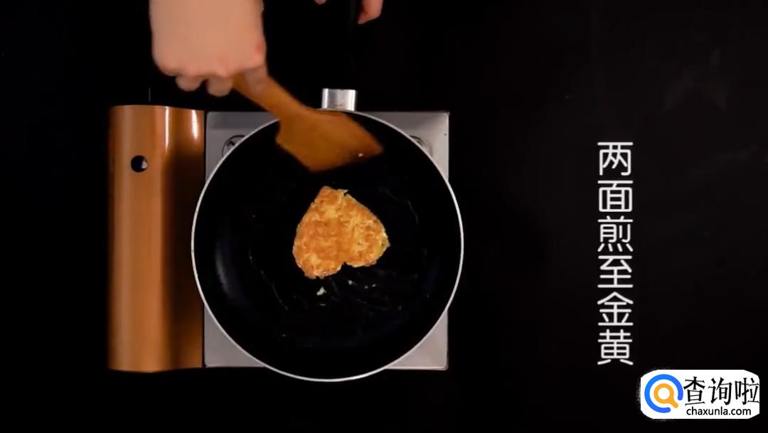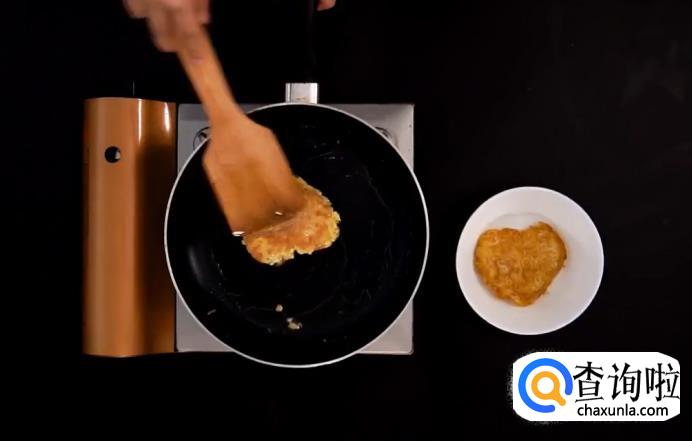 煎至定型后,脱模,翻面,两面煎至金黄后盛入盘中。用同样的方法,再煎一个泡面煎蛋。