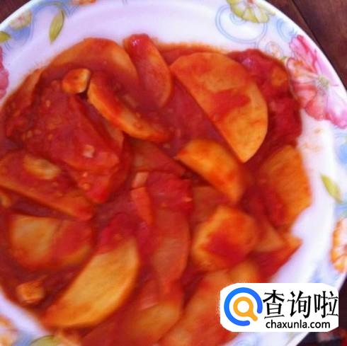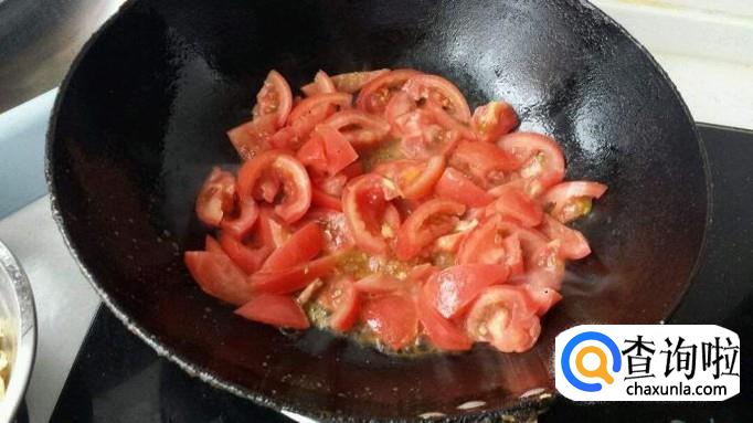 等待番茄差不多熟了以后,就再加入事先准备好的汤料再翻炒一小会儿,炒好后把其盛出来放在盘子里。