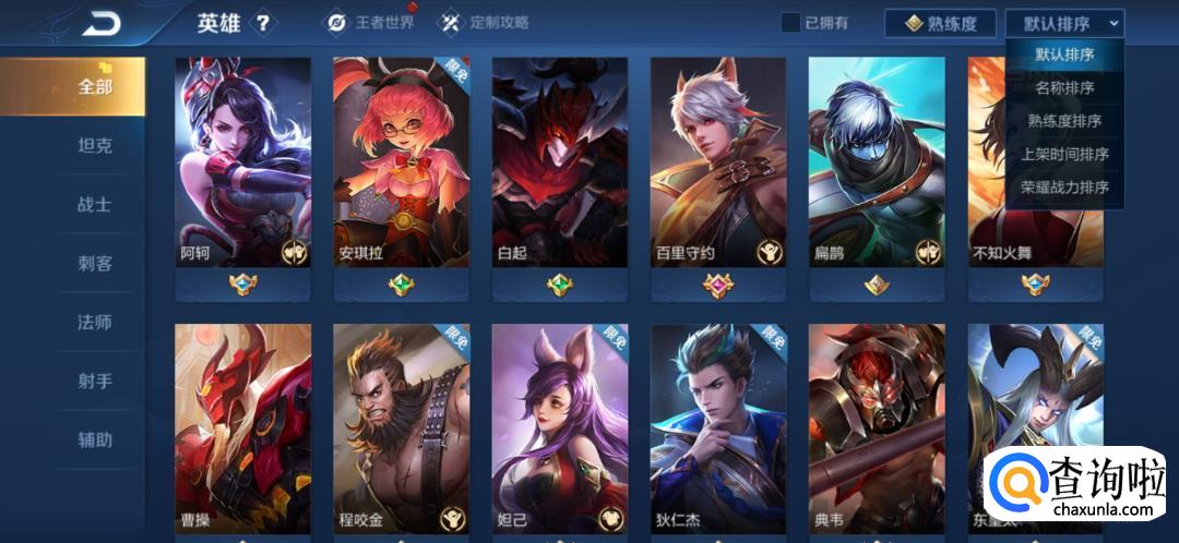 然后回到刚刚的英雄界面,在右上方选择按熟练度进行排序。然后展现的顺序就是之后选择英雄时候的排序了。