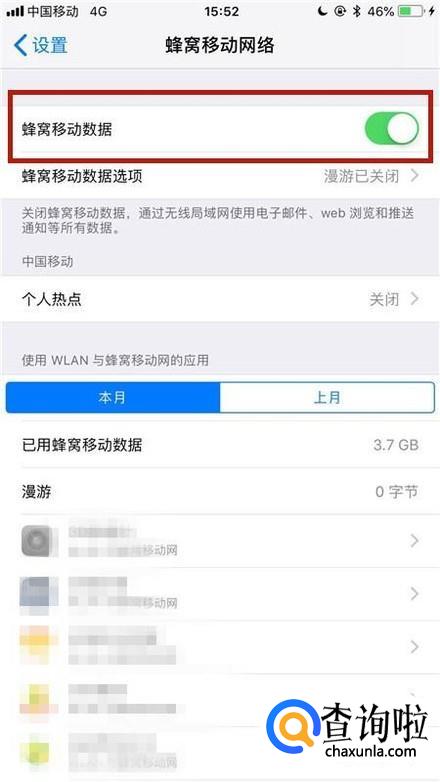 接着点击开启蜂窝移动数据开关,如下图所示。