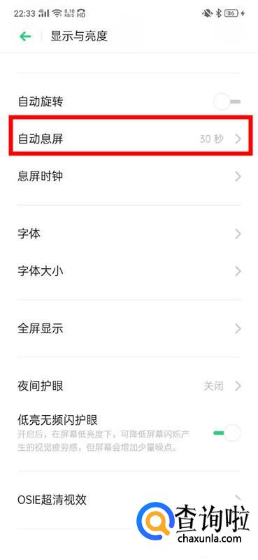 在这个界面找到【自动息屏】这个选项,点开选择自动息屏时间即可。