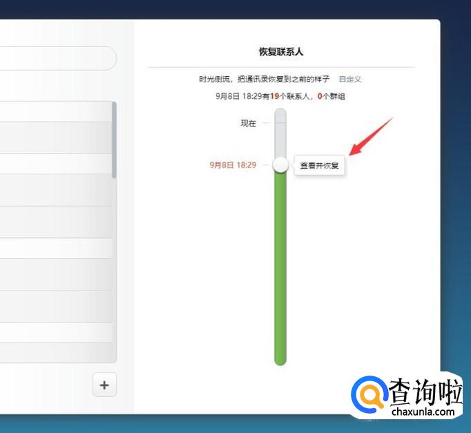 右侧出现可以选择的恢复时间点,选择好以后点击查看并恢复,这样即可恢复之前的通讯录了
