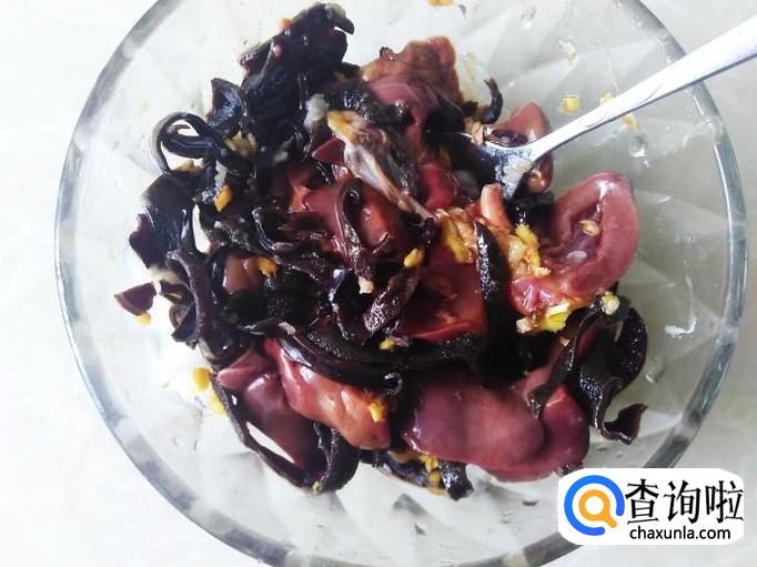 把木耳、鸡肝放到碗里,加适量的盐、姜蓉。