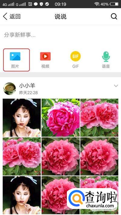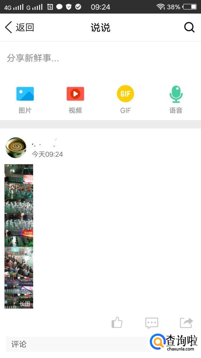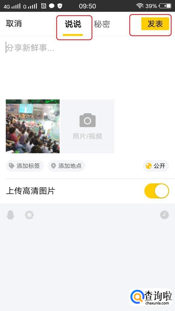 在“说说”界面,点击“图片”,把我们制作的长图选中以后,右上角点击“发表”就可以了。