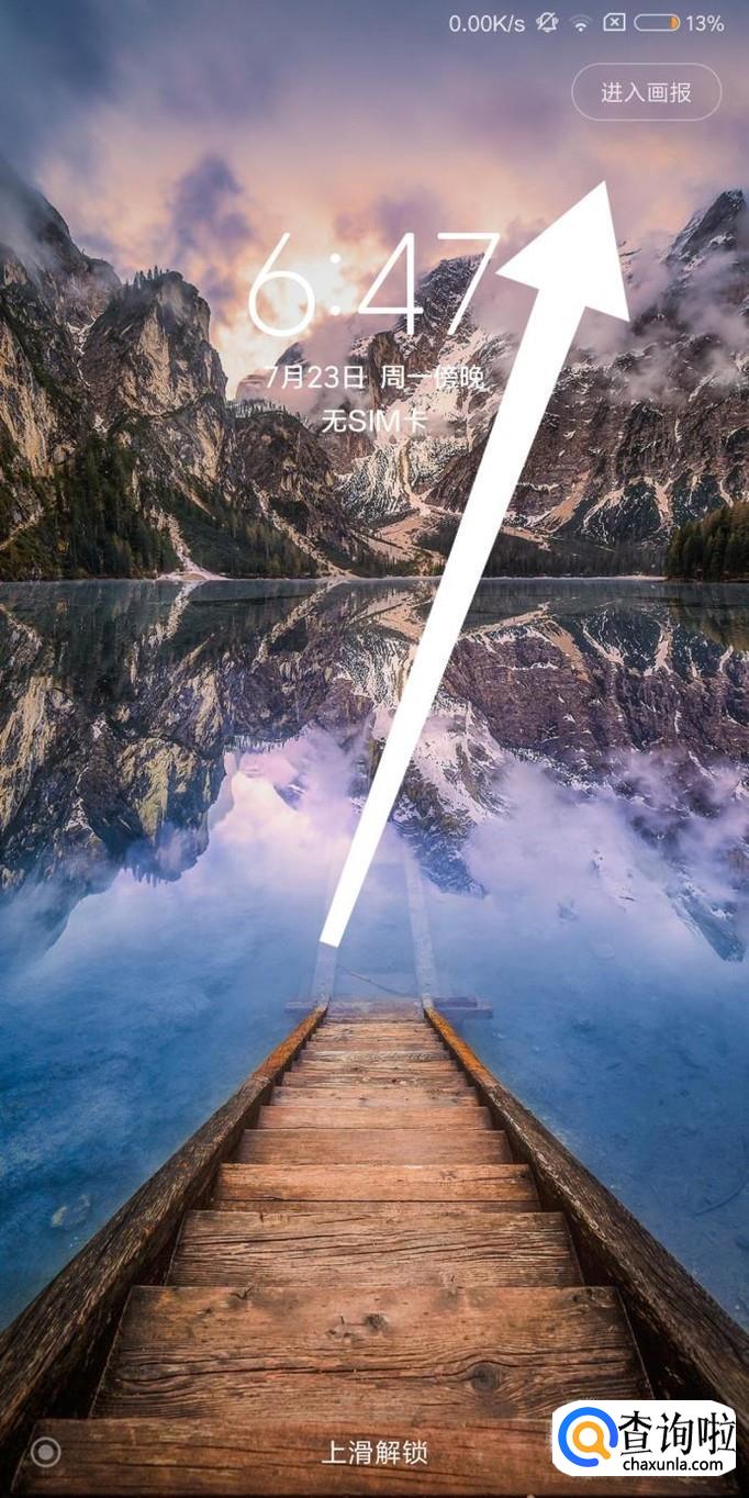 当手机处于锁屏的状态时,首先轻点一次屏幕,然后点击右上角的“进入画报”字样。