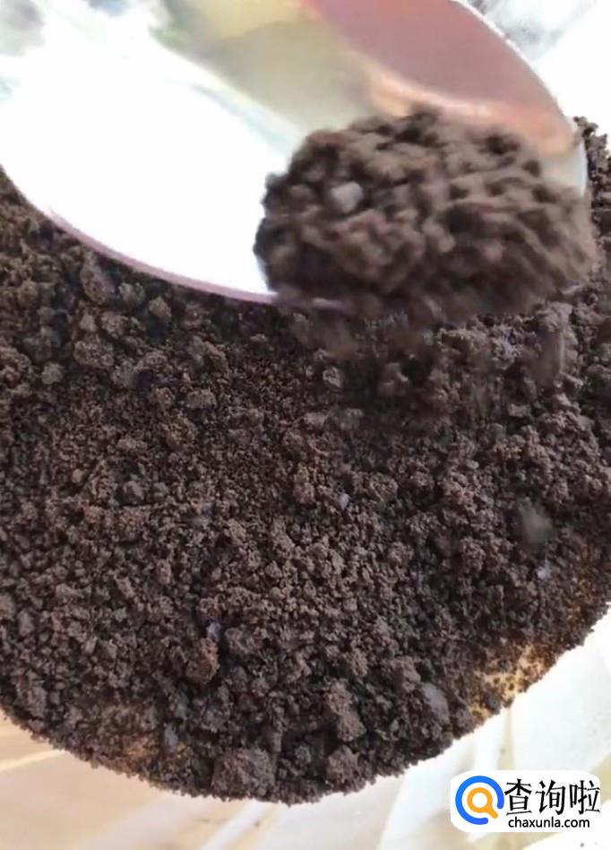 接着我们将奥利奥饼干碎放在酸奶昔上面,用勺子铺平