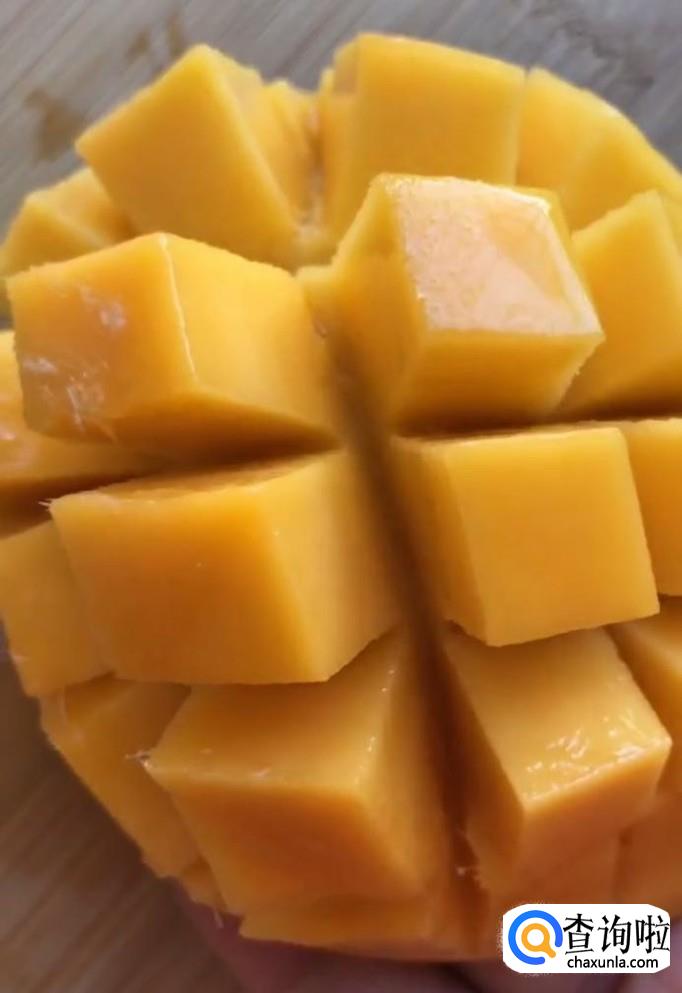 首先我们将芒果清洗干净对半切开,改刀切一下取出果肉