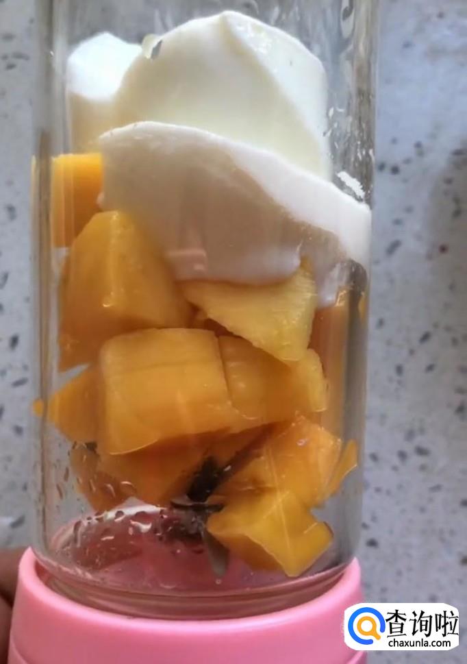 然后我们将果肉与酸奶一起放入榨汁机中榨成汁