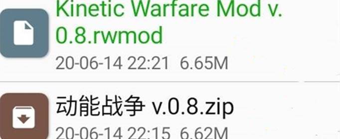 RW有一种文件类型,并且与四种不同的软件程序相关联,文件类型,并且与四种不同的软件程序相关联,安卓手机想打开.rwmod文件,找到本站下载的Mod包(以动能战争为例),分享的Mod包多为ZIP格式需要用压缩工具进行解压,会解压出来一个.rwmod后缀的Mod文件。