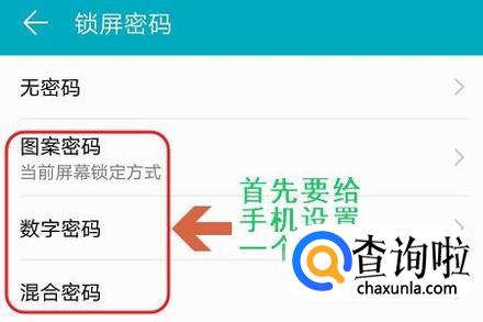 在锁屏密码选项中,我们要将系统之前的无密码更改为图案密码、数字密码或者组合密码其中的任意一种都可以,如图二...