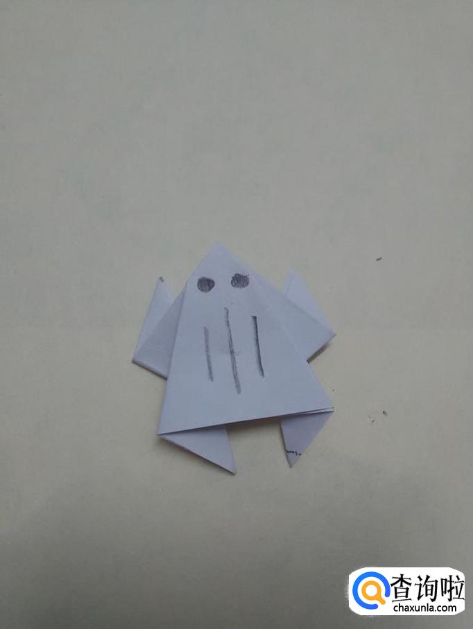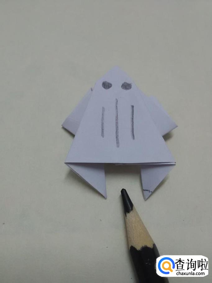 用笔在青蛙头上画两个黑点,表示眼睛,在眼睛下面画三条竖线,表示背上的条纹,小青蛙就折完了。