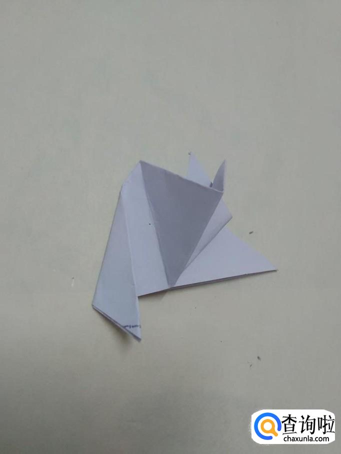 把纸反过来,为了说得更清楚,把纸上下颠倒一下,现在头朝上。把两个前腿掀起来,把下层的两个角往下折,然后把两只前腿再压下来,如下图,朝下的两个角就是两只后腿。