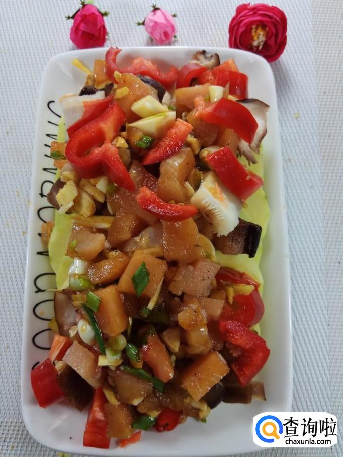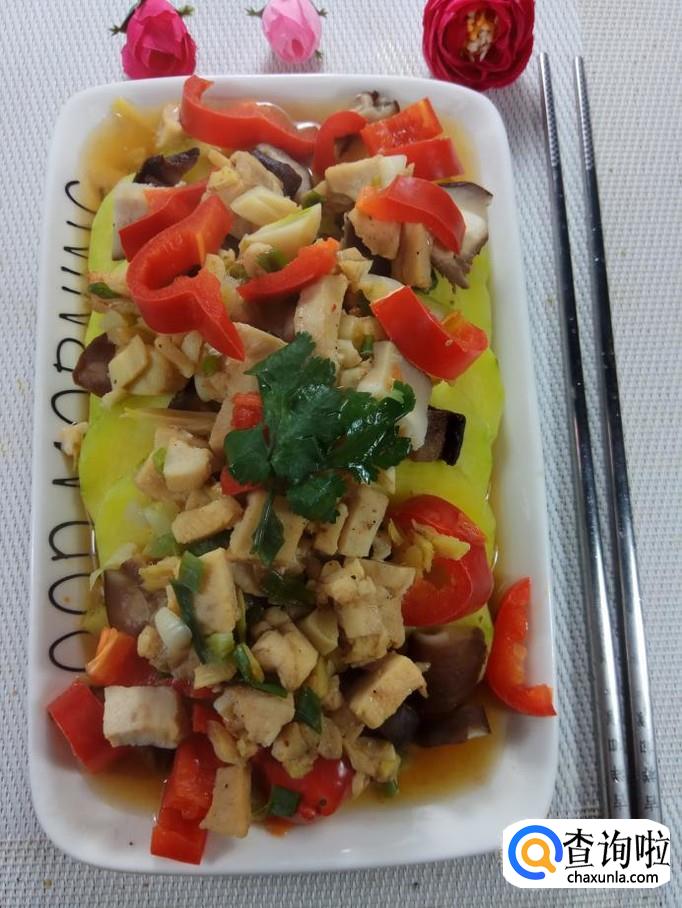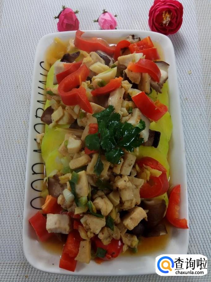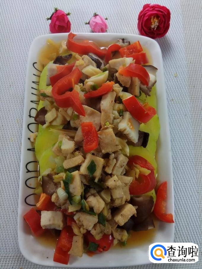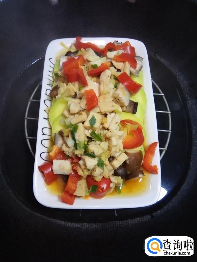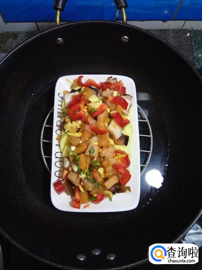 将香菇丁儿放在南瓜上面,然后将腌好的鸡胸肉和红椒也放在上面。
